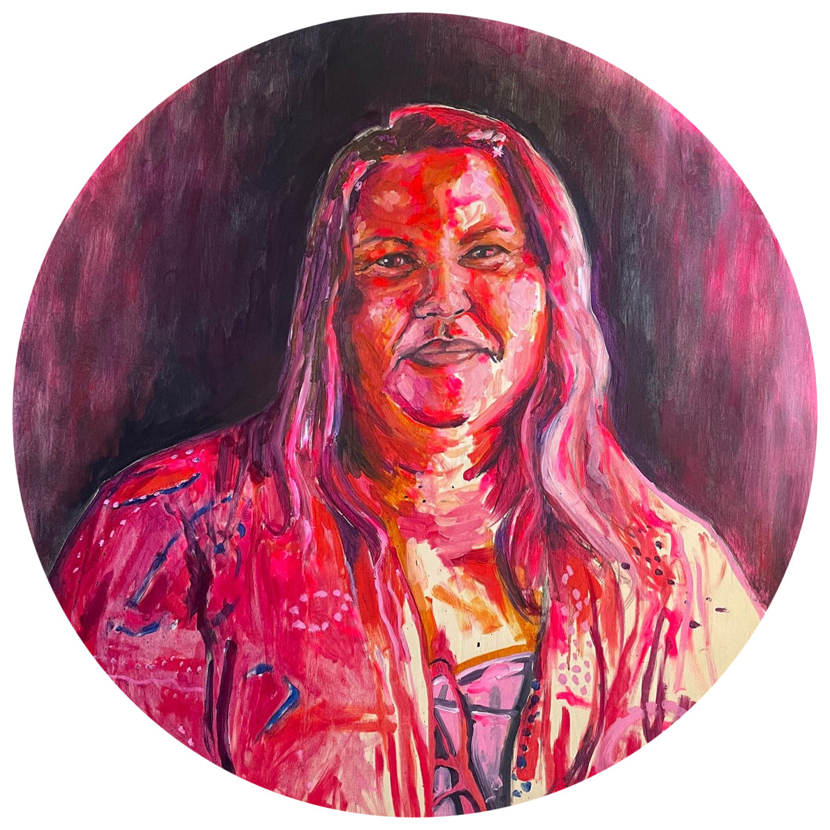 Portrait of Amanda Bell. As we chatted about our mothers in spirit, she glowed from the neon glow of her moorditj artwork, and the inner glow from a mother's love.